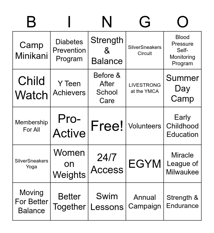 This bingo card has a free space and 26 words: 24/7 Access, Annual Campaign, Before & After School Care, Better Together, Blood Pressure Self-Monitoring Program, Camp Minikani, Child Watch, Diabetes Prevention Program, Early Childhood Education, EGYM, LIVESTRONG at the YMCA, Membership For All, Miracle League of Milwaukee, Moving For Better Balance, Pro-Active, Safety Around Water, SilverSneakers Circuit, SilverSneakers Yoga, Strength & Balance, Strength & Endurance, Summer Day Camp, Swim Lessons, Volunteers, Women on Weights, Y Teen Achievers and YMCA360.