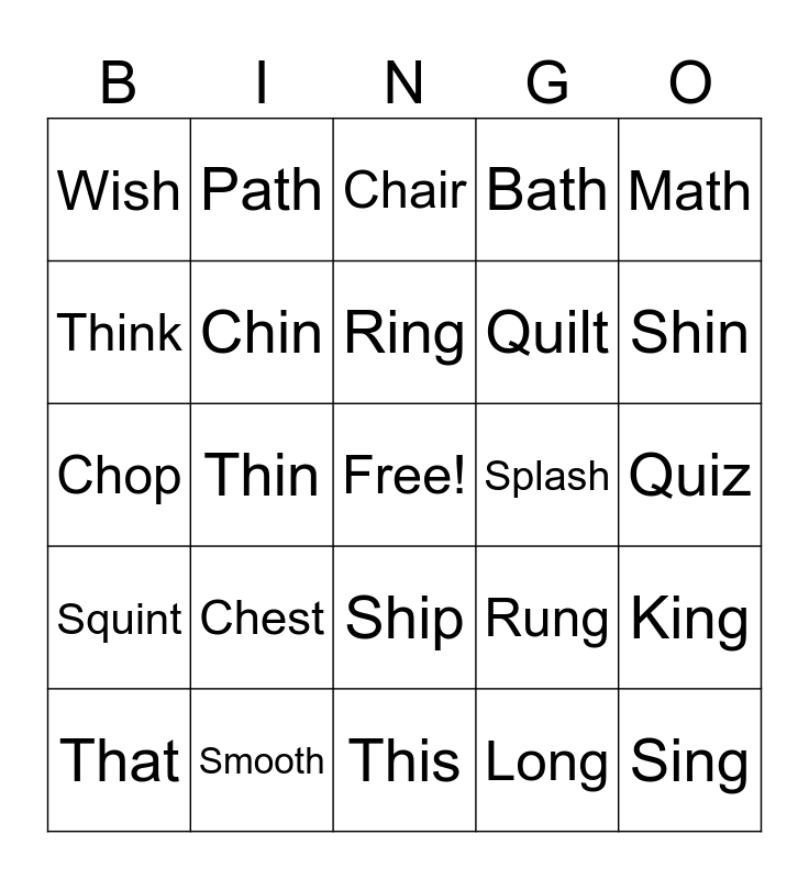 This bingo card has a free space and 39 words: Quit, Cheese, Shell, Chin, That, Ship, Ring, Shut, Math, Squint, Thin, Bath, Sing, Quiz, Splash, Chest, Spring, Wish, Stung, Rung, Think, This, Quilt, Shin, Fish, Lunch, Chip, Quest, Quill, Path, Thick, Thumb, Chair, Smooth, Long, Song, King, Chop and Shop.