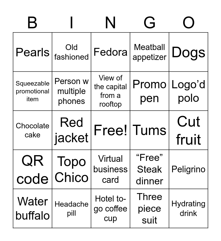 This bingo card has a free space and 29 words: Water buffalo, Cigar, Red jacket, Bottle of wine, Pearls, Fedora, Person w multiple phones, Topo Chico, Tums, Headache pill, Cut fruit, Hydrating drink, Hotel to-go coffee cup, Three piece suit, Logo’d polo, Paper business card, Virtual business card, QR code, Dogs, Chocolate cake, “Free” Steak dinner, Promo candy, Promo pen, Squeezable promotional item, Meatball appetizer, Old fashioned, Peligrino, View of the capital from a rooftop and View of the gym.