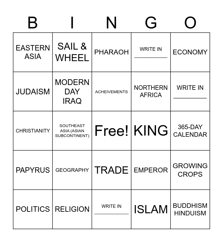 This bingo card has a free space and 24 words: GEOGRAPHY, RELIGION, ACHEIVEMENTS, POLITICS, ECONOMY, EASTERN ASIA, JUDAISM, SAIL & WHEEL, KING, TRADE, NORTHERN AFRICA, CHRISTIANITY, EMPEROR, GROWING CROPS, MODERN DAY IRAQ, ISLAM, 365-DAY CALENDAR, PHARAOH, WRITE IN __________, SOUTHEAST ASIA (ASIAN SUBCONTINENT), BUDDHISM HINDUISM, PAPYRUS, WRITE IN ____________ and WRITE IN ______________.