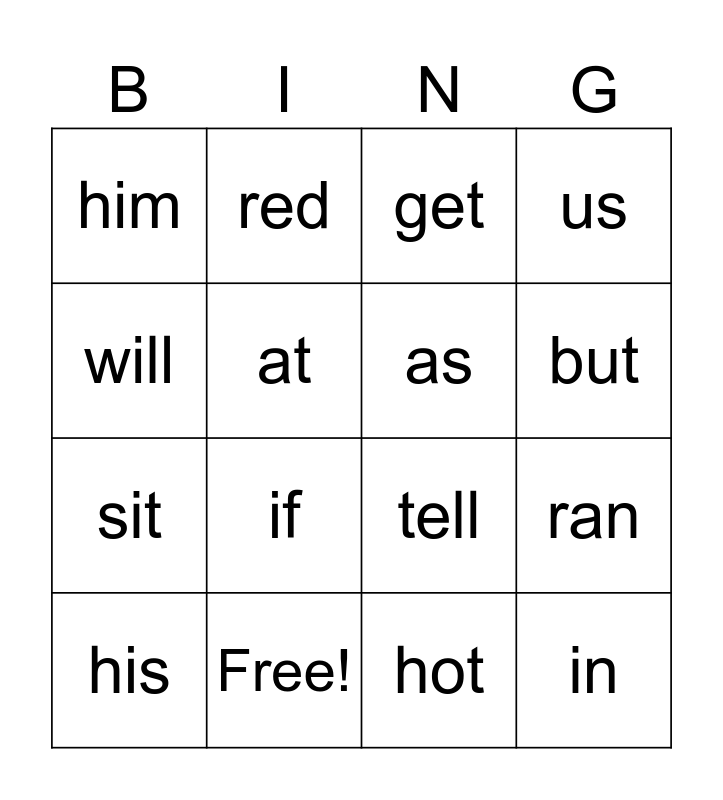 This bingo card has 16 words: Free!, ran, get, him, sit, red, tell, hot, will, at, his, us, if, but, as and in.
