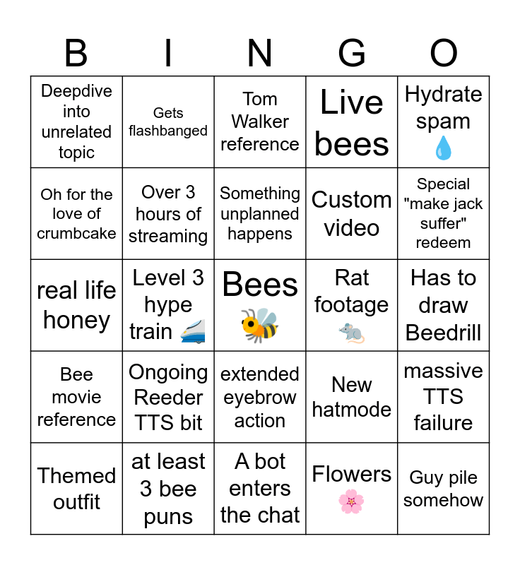 This bingo card has a free space and 24 words: Ongoing Reeder TTS bit, at least 3 bee puns, Something unplanned happens, Themed outfit, Hydrate spam💧, Deepdive into unrelated topic, Oh for the love of crumbcake, Gets flashbanged, Rat footage🐀, extended eyebrow action, Custom video, real life honey, New hatmode, massive TTS failure, Over 3 hours of streaming, Flowers🌸, Has to draw Beedrill, Tom Walker reference, Special "make jack suffer" redeem, Level 3 hype train 🚄, Guy pile somehow, Bee movie reference, Live bees and A bot enters the chat.