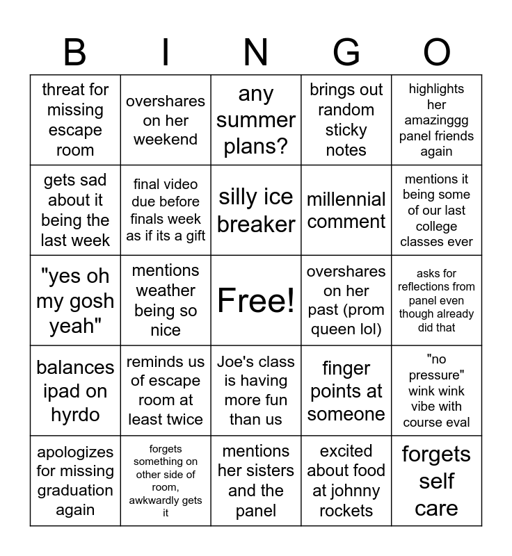 This bingo card has a free space and 24 words: reminds us of escape room at least twice, forgets something on other side of room, awkwardly gets it, silly ice breaker, apologizes for missing graduation again, highlights her amazinggg panel friends again, threat for missing escape room, gets sad about it being the last week, overshares on her weekend, overshares on her past (prom queen lol), Joe's class is having more fun than us, millennial comment, "yes oh my gosh yeah", finger points at someone, "no pressure" wink wink vibe with course eval, final video due before finals week as if its a gift, excited about food at johnny rockets, asks for reflections from panel even though already did that, any summer plans?, mentions it being some of our last college classes ever, mentions weather being so nice, forgets self care, balances ipad on hyrdo, brings out random sticky notes and mentions her sisters and the panel.