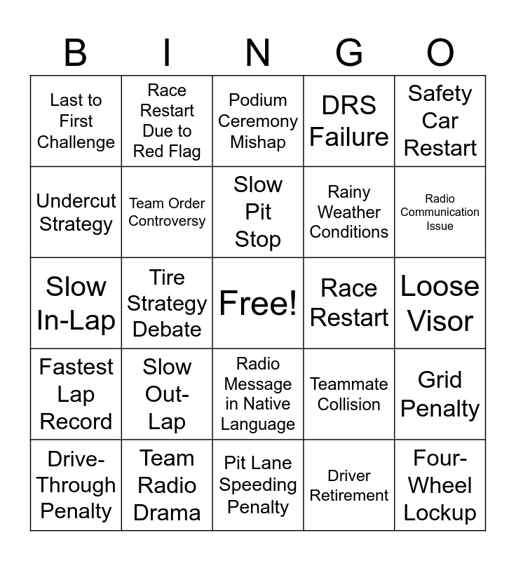This bingo card has a free space and 60 words: Safety Car Deployment, Team Radio Drama, Pit Stop Mishap, Fastest Lap Record, Driver Retirement, Tire Blowout, Team Order Controversy, Overtake at Eau Rouge, Rainy Weather Conditions, Formation Lap Incident, DRS Failure, Engine Failure, Undercut Strategy, Virtual Safety Car, Front Wing Damage, Last to First Challenge, Four-Wheel Lockup, Safety Car Restart, Team Principal Argument, Slow Pit Stop, Race Restart, Podium Ceremony Mishap, Drive-Through Penalty, Grid Penalty, Onboard Camera Glitch, Controversial Steward Decision, Track Limit Violation, DNF Due to Collision, Radio Communication Issue, Slow Formation Lap, Safety Car Queue Drama, Driver Retirement Due to Mechanical Failure, Team Strategy Blunder, Successful Undercut, Race Restart Due to Red Flag, Fan Incident on Track, Team Radio Censorship, Tire Strategy Debate, DRS Zone Incident, Slow In-Lap, Curfew Violation Fine, Slow Out-Lap, Loose Visor, Driver Contract Announcement, Teammate Collision, Puncture, Safety Car Period, Team Gearbox Change, Engine Penalty, Radio Message in Native Language, Pit Lane Speeding Penalty, Driver Helmet Change, Safety Car Restart Drama, Slow Formation Lap Due to Warm-up Lap Incident, Sidepod Damage, ERS Failure, Race Restart Due to Track Debris, Fastest Pit Stop of the Race, Podium Interview Blunder and Team Radio Miscommunication.