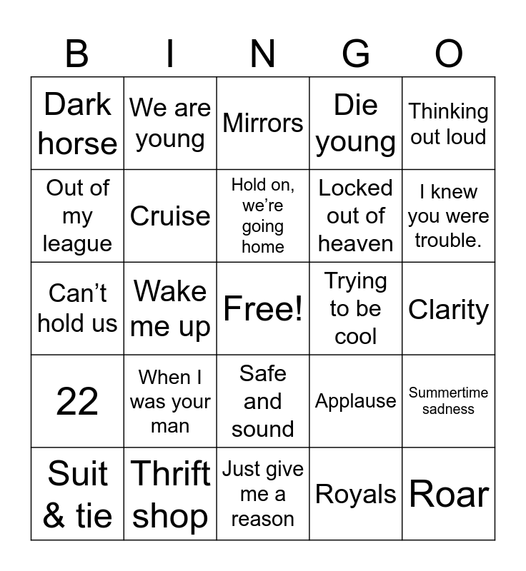 This bingo card has a free space and 46 words: Radioactive, Roar, Harlem shake, Just give me a reason, When I was your man, Don’t you worry child, We are young, Try, Out of my league, The monster, Cruise, Die young, Summertime sadness, Applause, Sweet nothing, Diamonds, Hold on, we’re going home, Trying to be cool, Alive, Thinking out loud, Wake me up, Royals, Dark horse, Locked out of heaven, Demons, I knew you were trouble., Suit & tie, Ho hey, Safe and sound, 22, Sail, Counting stars, Wagon wheel, Need your love, Love somebody, Thrift shop, Clarity, Stay, I love it, Come & get it, Treasure, Mirrors, Can’t hold us, We can’t stop, Get lucky and Blurred lines.