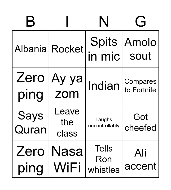 This bingo card has 16 words: Nasa WiFi, Got cheefed, Spits in mic, Albania, Says Quran, Rocket, Laughs uncontrollably, Tells Ron whistles, Zero ping, Ay ya zom, Zero ping, Amolo sout, Leave the class, Compares to Fortnite, Indian and Ali accent.