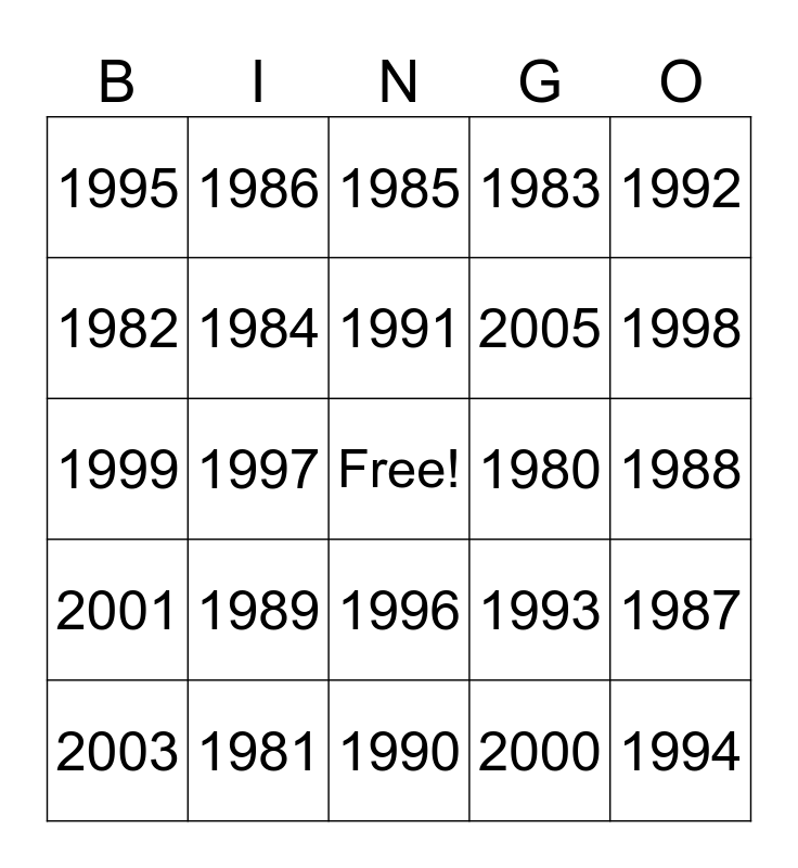 This bingo card has a free space and 24 words: 1989, 1981, 1991, 2003, 1992, 1995, 1982, 1986, 1980, 1996, 2005, 1999, 1993, 1987, 1984, 2000, 1988, 1985, 1998, 1997, 1994, 2001, 1983 and 1990.