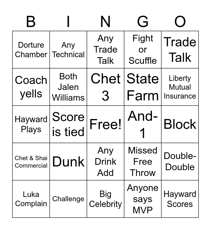 This bingo card has a free space and 24 words: Dunk, Challenge, Chet 3, Luka Complain, Trade Talk, Dorture Chamber, Coach yells, Any Technical, And-1, Any Drink Add, State Farm, Hayward Plays, Missed Free Throw, Double-Double, Both Jalen Williams, Anyone says MVP, Block, Any Trade Talk, Liberty Mutual Insurance, Score is tied, Hayward Scores, Chet & Shai Commercial, Fight or Scuffle and Big Celebrity.