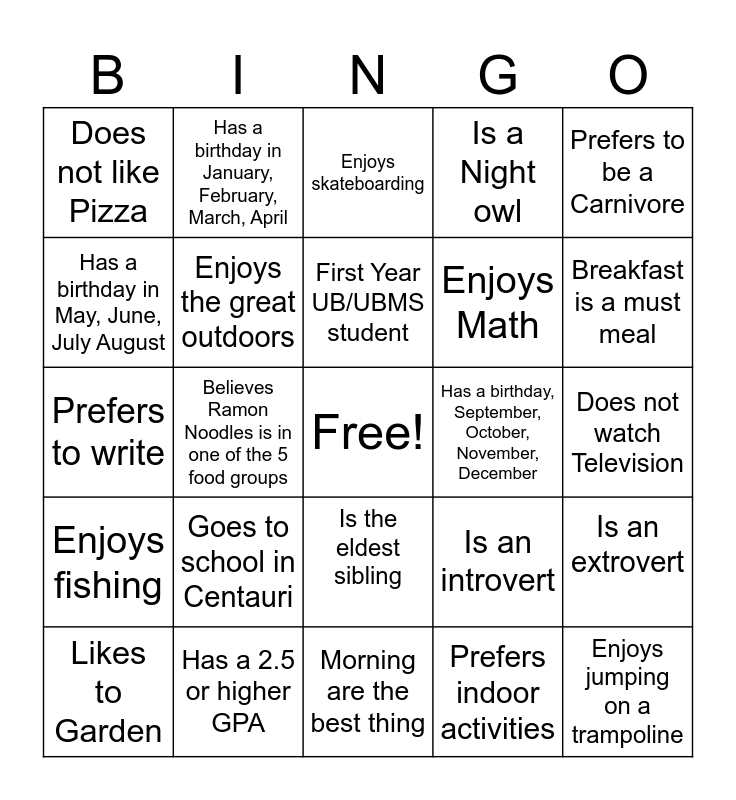 This bingo card has a free space and 24 words: Goes to school in Centauri, Has a 2.5 or higher GPA, First Year UB/UBMS student, Likes to Garden, Prefers to be a Carnivore, Does not like Pizza, Has a birthday in May, June, July August, Has a birthday in January, February, March, April, Has a birthday, September, October, November, December, Is the eldest sibling, Enjoys Math, Prefers to write, Is an introvert, Is an extrovert, Enjoys the great outdoors, Prefers indoor activities, Does not watch Television, Enjoys skateboarding, Breakfast is a must meal, Believes Ramon Noodles is in one of the 5 food groups, Enjoys jumping on a trampoline, Enjoys fishing, Is a Night owl and Morning are the best thing.