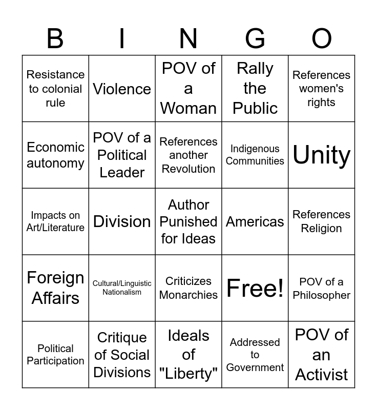 This bingo card has 25 words: Cultural/Linguistic Nationalism, Ideals of "Liberty", References another Revolution, Political Participation, References women's rights, Resistance to colonial rule, Economic autonomy, Violence, Americas, Criticizes Monarchies, Indigenous Communities, Impacts on Art/Literature, Free!, POV of a Philosopher, POV of a Political Leader, POV of an Activist, References Religion, POV of a Woman, Unity, Division, Author Punished for Ideas, Critique of Social Divisions, Foreign Affairs, Rally the Public and Addressed to Government.