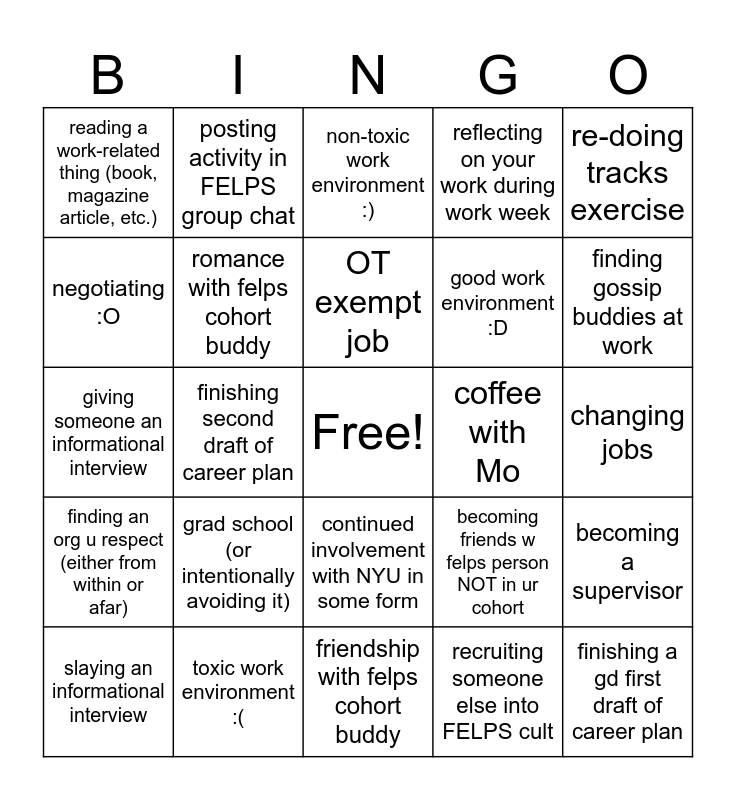 This bingo card has a free space and 24 words: grad school (or intentionally avoiding it), toxic work environment :(, OT exempt job, slaying an informational interview, re-doing tracks exercise, reading a work-related thing (book, magazine article, etc.), negotiating :O, posting activity in FELPS group chat, coffee with Mo, continued involvement with NYU in some form, good work environment :D, giving someone an informational interview, becoming friends w felps person NOT in ur cohort, becoming a supervisor, romance with felps cohort buddy, recruiting someone else into FELPS cult, changing jobs, non-toxic work environment :), finding gossip buddies at work, finishing second draft of career plan, finishing a gd first draft of career plan, finding an org u respect (either from within or afar), reflecting on your work during work week and friendship with felps cohort buddy.