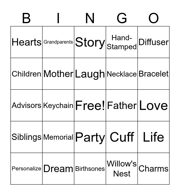 This bingo card has a free space and 25 words: Memorial, Birthsones, Laugh, Personalize, Diffuser, Hearts, Children, Grandparents, Father, Party, Necklace, Advisors, Cuff, Life, Mother, Rings, Love, Story, Bracelet, Keychain, Charms, Dream, Siblings, Hand-Stamped and Willow's Nest.