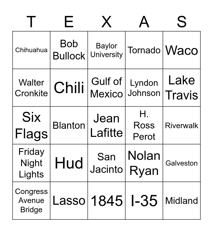 This bingo card has 62 words: Counties, Lasso, Austin, Friday Night Lights, Midland, Rice, Chili, 120, Lyndon Johnson, McKinney Falls, Tornado, Houston, Walter Cronkite, Red River, Athens, Chihuahua, Jean Lafitte, Waco, Sam Houston, Gulf of Mexico, H. Ross Perot, Baylor University, Congress Avenue Bridge, I-35, Big Bend National Park, Jim Bowie, San Antonio, Brownsville, Galveston, Beaumont, Harvey, Frito Lay, Palo Alto, Galveston Bay, Riverwalk, Bob Bullock, Texas Ranger, Lonesome Dove, Blanton, Guadalupe Mountains, Six Flags, Fiddle, Hud, Stevie Ray Vaughn, Lake Travis, Nolan Ryan, Mammoths, Buffalo Soldiers, Kolache, Matagorda Island, San Jacinto, 1845, Mockingbird, Dew, Balcones Escarpment, Buddy Holly, Clyde Stubblefield & Aaron Franklin, 1818, Thicket, Births, Uri and Prada.
