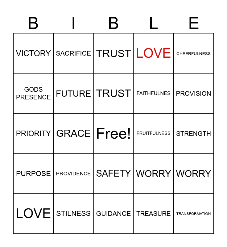 This bingo card has a free space and 29 words: LOVE, ANXIETY, GRACE, CARES, VICTORY, TRUST, FUTURE, PROVIDENCE, FRUITFULNESS, STILNESS, STRENGTH, TRANSFORMATION, GUIDANCE, TREASURE, PROVISION, SALVATION, SAFETY, PURPOSE, CHEERFULNESS, PRIORITY, WORRY, COURAGE, FAITHFULNES, GODS PRESENCE, LOVE, SACRIFICE, WORRY, TRUST and PROVISION.