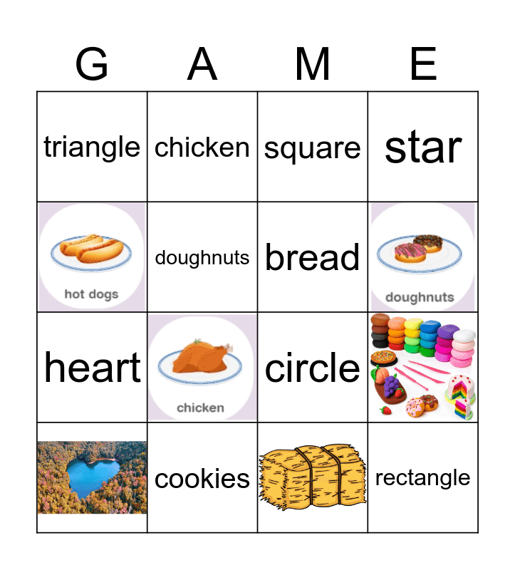 This bingo card has 10 images and 12 words: cookies, pizza, chicken, hotdogs, doughnuts, bread, triangle, square, circle, rectangle, heart and star.