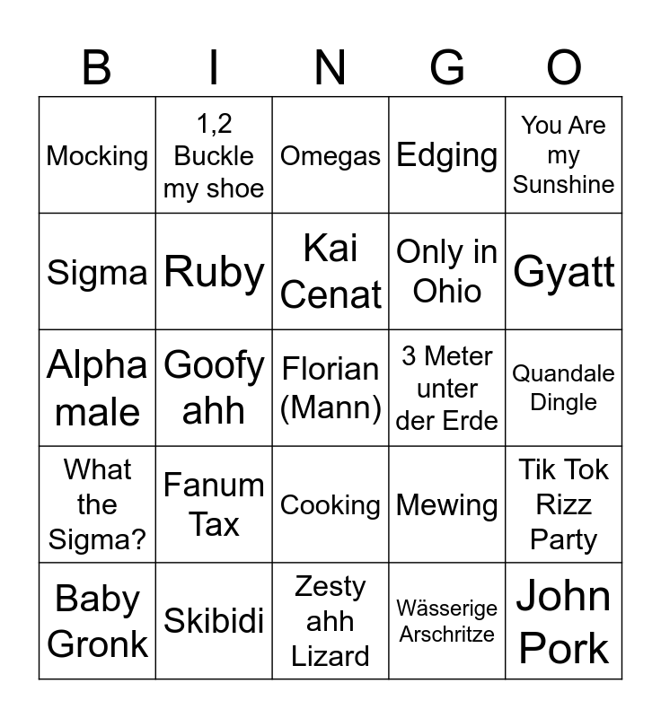 This bingo card has a free space and 24 words: Fanum Tax, Skibidi, Kai Cenat, Baby Gronk, You Are my Sunshine, Mocking, Sigma, 1,2 Buckle my shoe, 3 Meter unter der Erde, Cooking, Only in Ohio, Alpha male, Mewing, Tik Tok Rizz Party, Ruby, Wässerige Arschritze, Quandale Dingle, Omegas, Gyatt, Goofy ahh, John Pork, What the Sigma?, Edging and Zesty ahh Lizard.