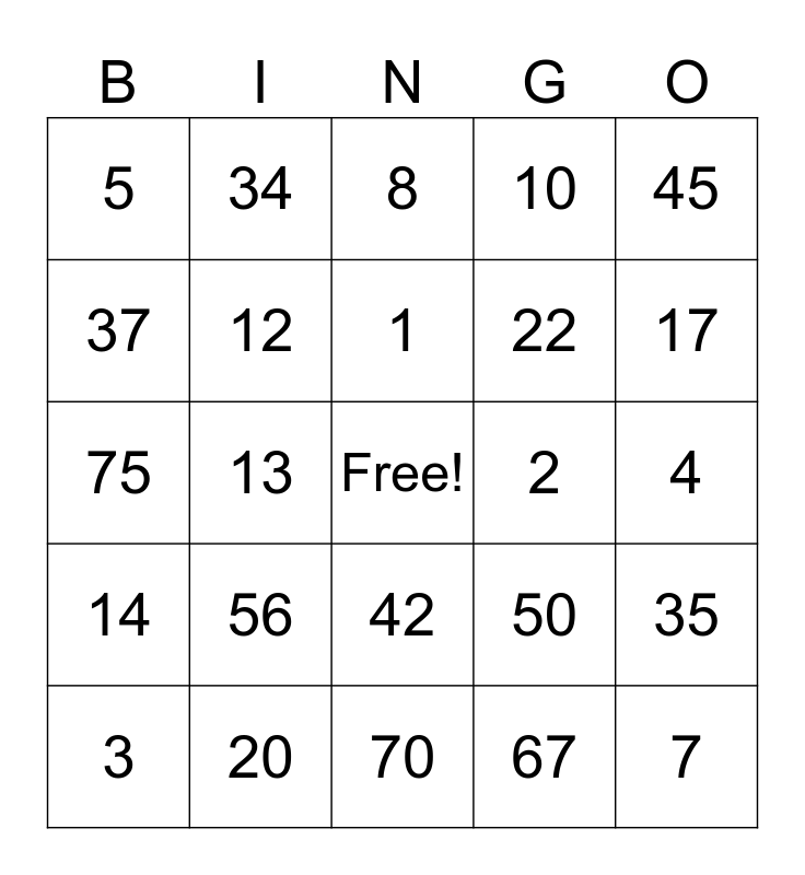 This bingo card has a free space and 24 words: 56, 20, 1, 3, 45, 5, 37, 34, 2, 42, 22, 75, 50, 35, 12, 67, 4, 8, 17, 13, 7, 14, 10 and 70.