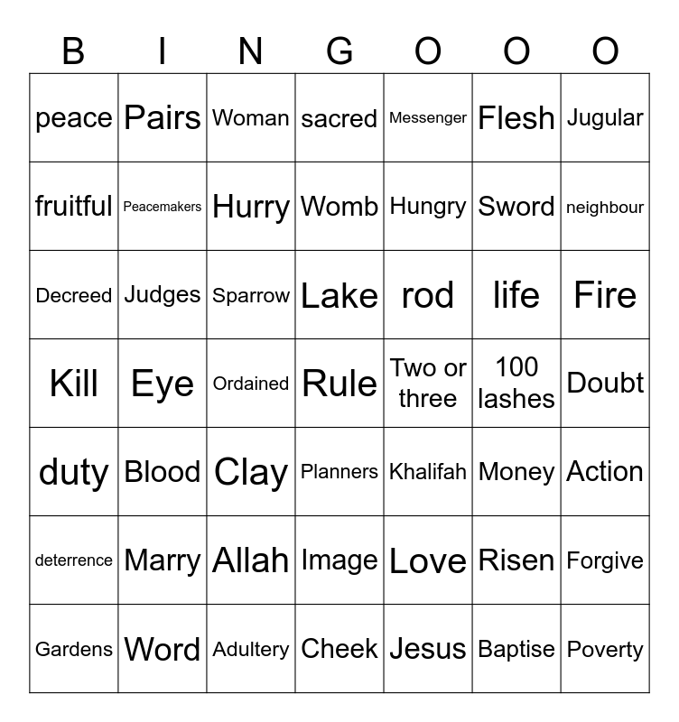 This bingo card has a free space and 48 words: Love, Sword, Cheek, Eye, Sparrow, Doubt, Pairs, Word, Flesh, Planners, Jugular, sacred, life, rod, deterrence, 100 lashes, fruitful, neighbour, Risen, Messenger, Hungry, Ordained, peace, Peacemakers, Forgive, Hurry, Fire, Gardens, Lake, Judges, Baptise, Two or three, Action, Marry, Kill, Khalifah, Money, Decreed, Clay, Allah, duty, Poverty, Woman, Adultery, Womb, Image, Blood and Jesus.