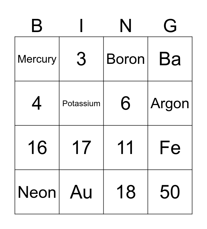 This bingo card has 16 words: Au, Fe, Boron, Mercury, 16, 3, 11, 18, 4, Potassium, Neon, Ba, 17, Argon, 6 and 50.