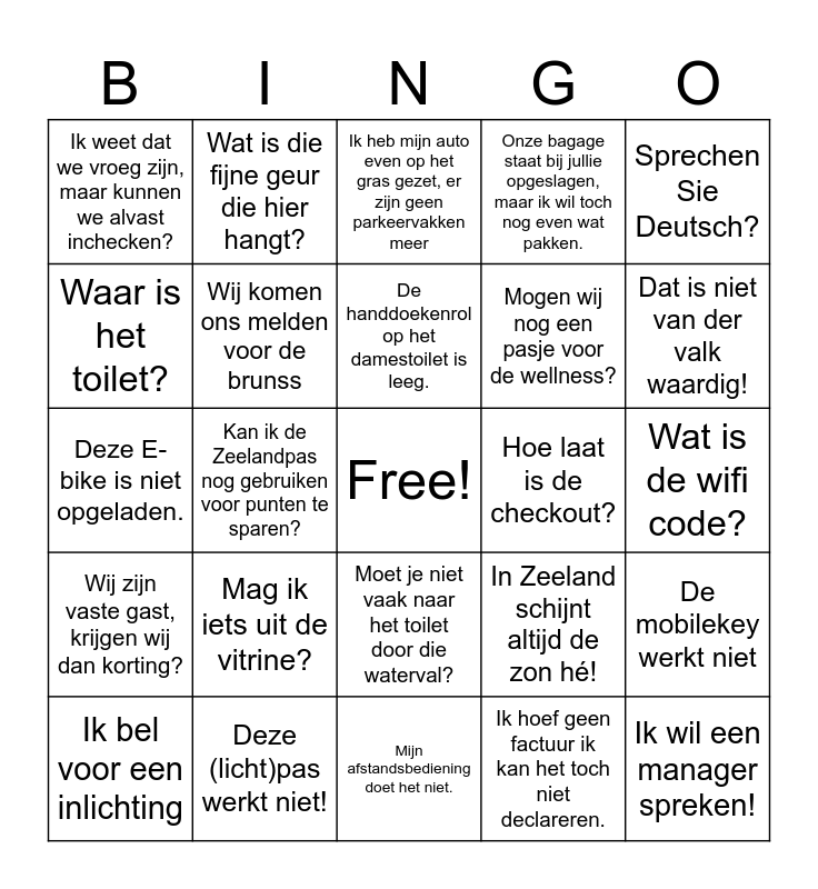 This bingo card has a free space and 24 words: Mag ik iets uit de vitrine?, Deze (licht)pas werkt niet!, De handdoekenrol op het damestoilet is leeg., Ik bel voor een inlichting, Sprechen Sie Deutsch?, Ik weet dat we vroeg zijn, maar kunnen we alvast inchecken?, Waar is het toilet?, Wat is die fijne geur die hier hangt?, Hoe laat is de checkout?, Moet je niet vaak naar het toilet door die waterval?, Mogen wij nog een pasje voor de wellness?, Deze E-bike is niet opgeladen., In Zeeland schijnt altijd de zon hé!, De mobilekey werkt niet, Wij komen ons melden voor de brunss, Ik hoef geen factuur ik kan het toch niet declareren., Wat is de wifi code?, Ik heb mijn auto even op het gras gezet, er zijn geen parkeervakken meer, Dat is niet van der valk waardig!, Kan ik de Zeelandpas nog gebruiken voor punten te sparen?, Ik wil een manager spreken!, Wij zijn vaste gast, krijgen wij dan korting?, Onze bagage staat bij jullie opgeslagen, maar ik wil toch nog even wat pakken. and Mijn afstandsbediening doet het niet..