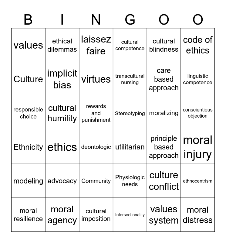 This bingo card has 36 words: Physiologic needs, Community, Intersectionality, Culture, Ethnicity, Stereotyping, implicit bias, cultural imposition, cultural blindness, culture conflict, linguistic competence, cultural competence, ethnocentrism, cultural humility, transcultural nursing, values, modeling, moralizing, responsible choice, laissez faire, rewards and punishment, ethics, utilitarian, deontologic, principle based approach, ethical dilemmas, care based approach, moral agency, virtues, code of ethics, moral distress, moral resilience, moral injury, conscientious objection, advocacy and values system.
