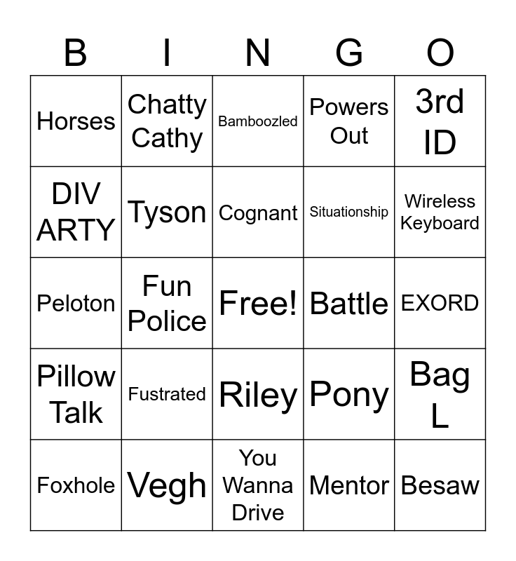 This bingo card has a free space and 24 words: Fustrated, Vegh, Cognant, Foxhole, 3rd ID, Horses, DIV ARTY, Chatty Cathy, Battle, Riley, Situationship, Peloton, Pony, Bag L, Tyson, Mentor, EXORD, Bamboozled, Wireless Keyboard, Fun Police, Besaw, Pillow Talk, Powers Out and You Wanna Drive.