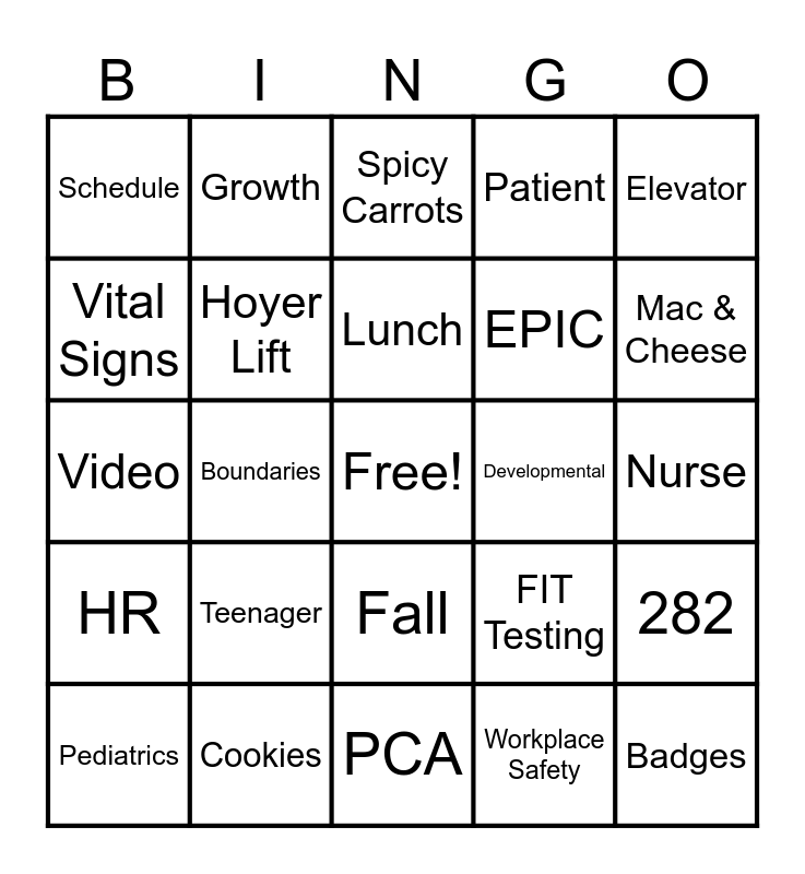 This bingo card has a free space and 35 words: Oxygen Tank, Emergency, Injury, Hoyer Lift, Fall, Patient, Vital Signs, Orientation, Lunch, Break, Video, Elevator, Restroom, POCT, Schedule, Developmental, Workplace Safety, Boundaries, HR, Badges, FIT Testing, Pediatrics, 282, Cookies, Spicy Carrots, Mac & Cheese, Distraction, Infant, EPIC, Nurse, MA, PCA, Teenager, Growth and Family Centered Care.
