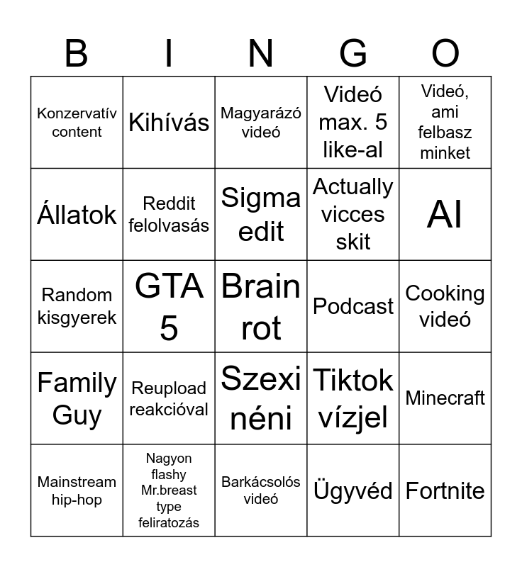 This bingo card has a free space and 24 words: Reupload reakcióval, Nagyon flashy Mr.breast type feliratozás, Sigma edit, Mainstream hip-hop, Videó, ami felbasz minket, Konzervatív content, Állatok, Kihívás, Podcast, Szexi néni, Actually vicces skit, Random kisgyerek, Tiktok vízjel, Minecraft, Reddit felolvasás, Ügyvéd, Cooking videó, Magyarázó videó, AI, GTA 5, Fortnite, Family Guy, Videó max. 5 like-al and Barkácsolós videó.