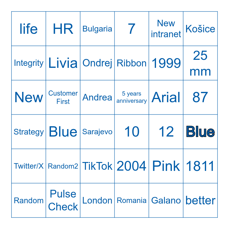 This bingo card has 36 words: 2004, TikTok, Romania, Integrity, Strategy, 5 years anniversary, Livia, London, New intranet, Pink, 25 mm, 7, 1811, Customer First, Ribbon, life, Twitter/X, Arial, New, Bulgaria, Andrea, Blue, 10, Sarajevo, 12, HR, 1999, Pulse Check, Ondrej, Košice, better, Random, Blue, 87, Random2 and Galano.