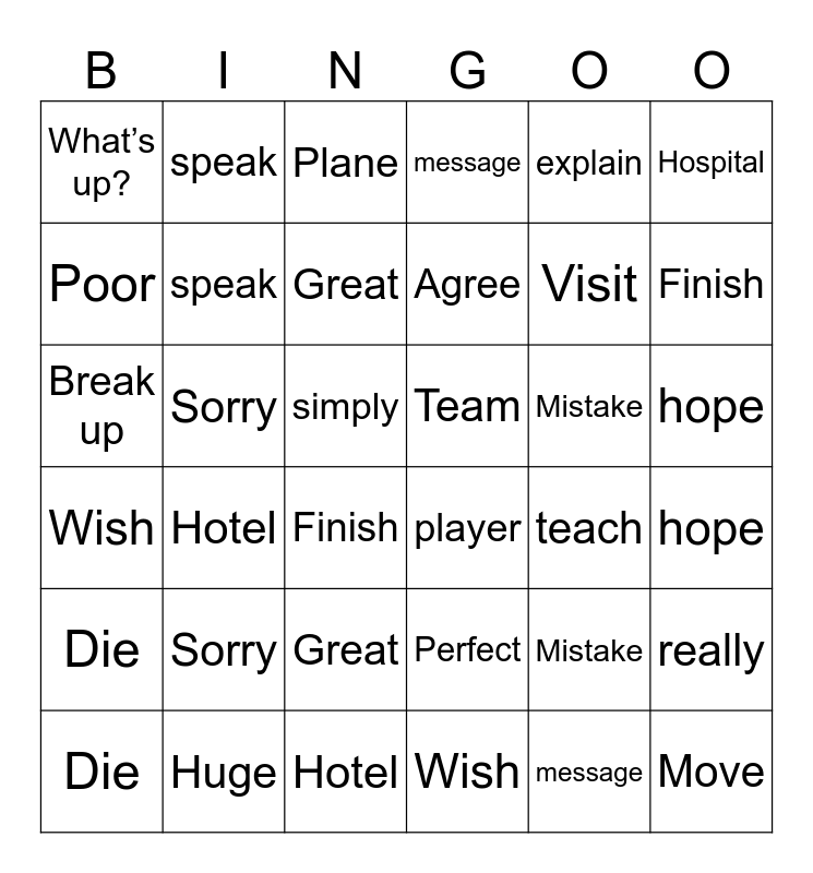 This bingo card has 60 words: Perfect, player, school, Team, hope, teach, Poor, Move, Great, really, message, worry, Hospital, Die, feel, What’s up?, Break up, explain, Welcome, speak, Sorry, Plane, Finish, Hotel, Visit, Huge, Mistake, simply, Agree, Wish, Welcome, What’s up?, Break up, explain, speak, Sorry, Plane, Finish, Hotel, Visit, Huge, Mistake, simply, Agree, Wish, Perfect, player, school, Team, hope, teach, Poor, Move, Great, really, message, worry, Hospital, Die and feel.