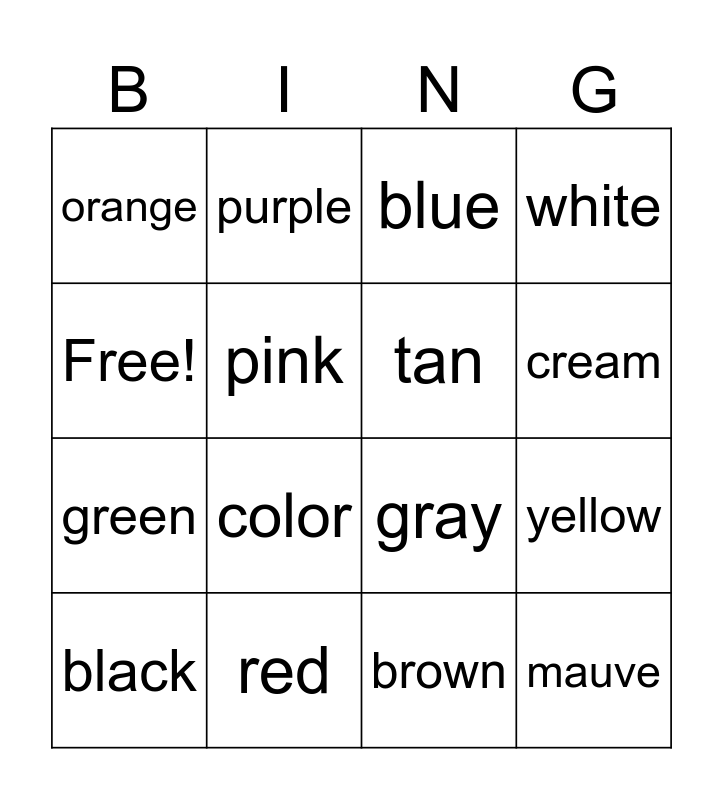 This bingo card has 16 words: red, yellow, blue, orange, green, purple, gray, brown, Free!, pink, black, white, color, cream, tan and mauve.