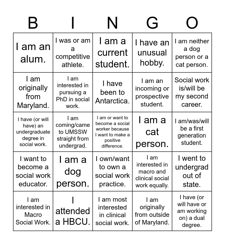 This bingo card has a free space and 29 words: I am interested in Macro Social Work., I am/was most excited about Field., I am coming/came to UMSSW straight from undergrad., For me, social work is the family business., I am an alum., I am a current student., I am interested in pursuing a PhD in social work., I am a dog person., I am a cat person., I attended a HBCU., I am/was/will be a first generation student., I have (or will have or am working on) a dual degree., I am most interested in clinical social work., I am originally from outside of Maryland., Social work is/will be my second career., I became/want to become a social worker because I know someone who is a social worker., I own/want to own a social work practice., I want to become a social work educator., I am neither a dog person or a cat person., I have (or will have) an undergraduate degree in social work., I am interested in macro and clinical social work equally., I am/want to be a social worker focused on policy., I am an incoming or prospective student., I am originally from Maryland., I have an unusual hobby., I was or am a competitive athlete., I went to undergrad out of state., I have been to Antarctica. and I was a Peace Corps or AmeriCorps Volunteer..