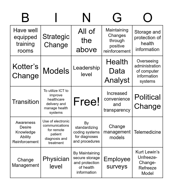 This bingo card has a free space and 24 words: Use of electronic communications for remote patient diagnosis and treatment, Physician level, Leadership level, Change Management, Storage and protection of health information, Have well equipped training rooms, Kotter’s Change, Strategic Change, Increased convenience and transparency, By standardizing coding systems for diagnoses and procedures, Health Data Analyst, Transition, Change management models, Telemedicine, Models, Employee surveys, Political Change, All of the above, Overseeing administration of computer information systems, To utilize ICT to improve healthcare delivery and manage health systems, Kurt Lewin’s Unfreeze-Change-Refreeze Model, Awareness Desire Knowledge Ability Reinforcement, Maintaining Changes through positive reinforcement and By Maintaining secure storage and protection of health information.