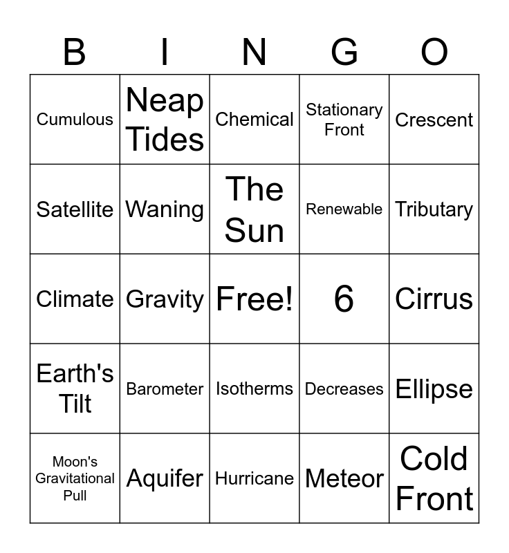 This bingo card has a free space and 34 words: 8, Meteor, Comet, Revolution, Earth's Tilt, Waning, Crescent, Moon's Gravitational Pull, Neap Tides, Spring Tides, The Sun, Chemical, Condensation, Evaporation, 6, Tributary, Aquifer, Climate, Barometer, Decreases, Isotherms, Ozone, Cumulous, Cirrus, Hurricane, Cold Front, Stationary Front, The Sun, Renewable, Satellite, Asteroid, Gravity, Ellipse and Waxing.