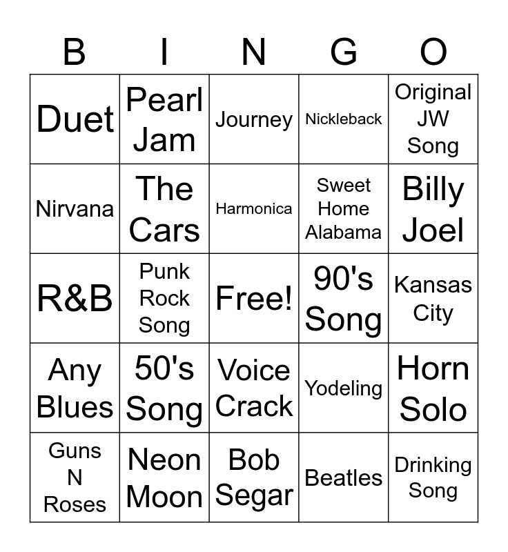 This bingo card has a free space and 29 words: Guns N Roses, Someone Yelling "Free Bird", Punk Rock Song, Elvis Presley, Duet, Journey, The Cars, 50's Song, 90's Song, Neon Moon, Kansas City, Drinking Song, Bob Segar, Beatles, Billy Joel, Guitar Solo, Voice Crack, Any Blues, Original JW Song, R&B, Yodeling, Cranberries, Sweet Home Alabama, Nirvana, Nickleback, Pearl Jam, Horn Solo, Harmonica and Spanish Song.