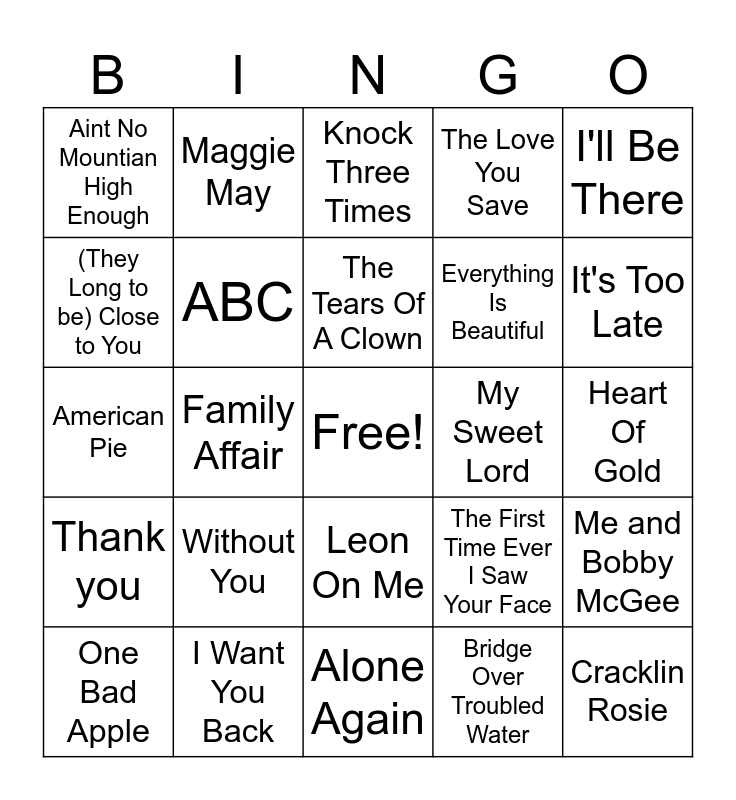 This bingo card has a free space and 60 words: Raindrops Keep Fallin On My Head, I Want You Back, Venus, Thank you, Bridge Over Troubled Water, Let It Be, ABC, No Sugar Tonight, Everything Is Beautiful, The Long And Winding Road, The Love You Save, Mama Told Me, (They Long to be) Close to You, Make It With You, War, Aint No Mountian High Enough, Cracklin Rosie, I'll Be There, I Think I Love You, The Tears Of A Clown, My Sweet Lord, Knock Three Times, One Bad Apple, Me and Bobby McGee, Just My Imagination, Joy To The World, Brown Sugar, Want Ads, It's Too Late, Indian Reservation, You've Got A Friend, How Can You Mend A Broken Heart, Uncle Albert/Admiral Halsey, Go Away Little Girl, Maggie May, Gypsys Tramps & Thieves, Theme From Shaft, Family Affair, Brand New Key, American Pie, Lets Stay Together, Without You, Heart Of Gold, A HORSE WITH NO NAME, The First Time Ever I Saw Your Face, Oh Girl, I'll Take You There, Candy man, Song Sung Blue, Leon On Me, Alone Again, Brandy You're A Fine Girl, Black and White, Baby, Dont Get Hooked on Me, Ben, My Ding-A-Ling, I Can See Clearly Now, Papa Was A Rollin Stone, I Am Woman and Me and Mrs. Jones.