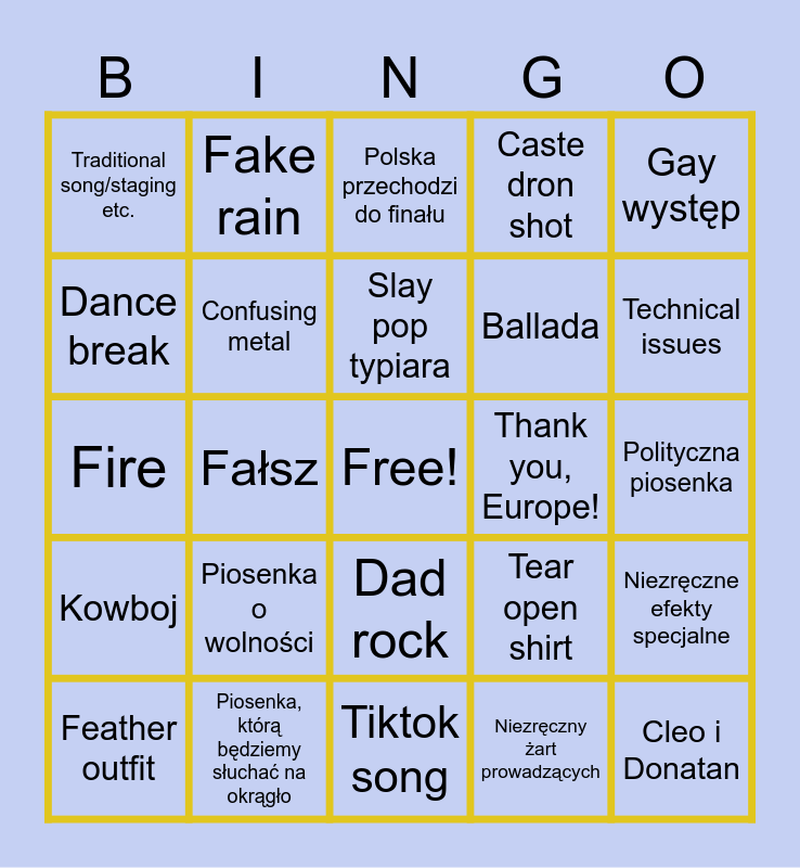 This bingo card has a free space and 24 words: Piosenka o wolności, Piosenka, którą będziemy słuchać na okrągło, Slay pop typiara, Feather outfit, Gay występ, Traditional song/staging etc., Dance break, Fake rain, Thank you, Europe!, Dad rock, Ballada, Fire, Tear open shirt, Niezręczne efekty specjalne, Confusing metal, Niezręczny żart prowadzących, Polityczna piosenka, Polska przechodzi do finału, Technical issues, Fałsz, Cleo i Donatan, Kowboj, Caste dron shot and Tiktok song.