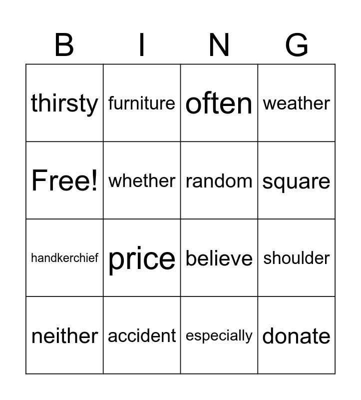 This bingo card has 16 words: accident, shoulder, often, thirsty, handkerchief, furniture, believe, especially, Free!, whether, neither, weather, price, square, random and donate.