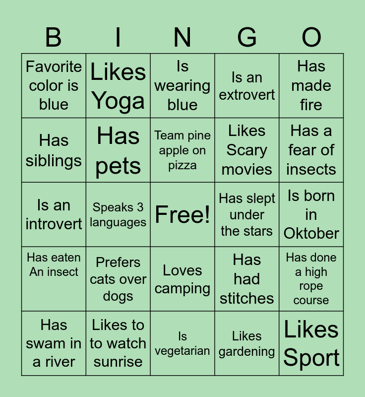 This bingo card has a free space and 24 words: Prefers cats over dogs, Likes to to watch sunrise, Team pine apple on pizza, Has swam in a river, Has made fire, Favorite color is blue, Has siblings, Likes Yoga, Has slept under the stars, Loves camping, Likes Scary movies, Is an introvert, Has had stitches, Has done a high rope course, Has pets, Likes gardening, Is born in Oktober, Is wearing blue, Has a fear of insects, Speaks 3 languages, Likes Sport, Has eaten An insect, Is an extrovert and Is vegetarian.