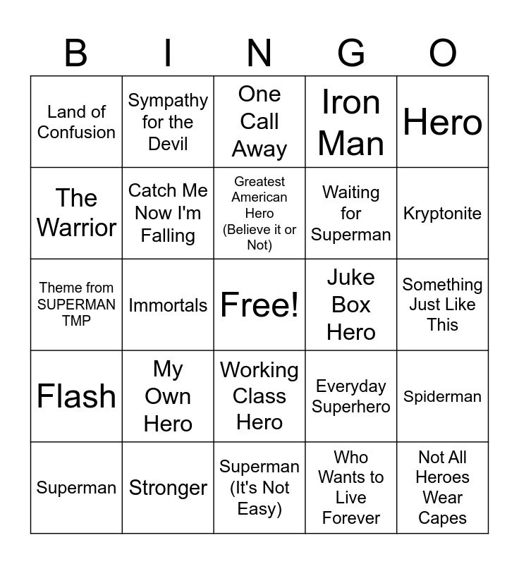 This bingo card has a free space and 36 words: Ain't No Rest for the Wicked, Anti-Hero, BURN IT DOWN, Catch Me Now I'm Falling, Everyday Superhero, Flash, Greatest American Hero (Believe it or Not), Heroes, Hero, Holding Out For A Hero, Immortals, Iron Man, Jimmy Olsen's Blues, Juke Box Hero, Kryptonite, Land of Confusion, My Hero, My Own Hero, Not All Heroes Wear Capes, One Call Away, Something Just Like This, Spiderman, Stronger, Superman, Superman (It's Not Easy), Sympathy for the Devil, Theme from SUPERMAN TMP, Titanium, Waiting for Superman, The Warrior, We Don't Need Another Hero, White Wedding, Who Wants to Live Forever, Working Class Hero, You Don't Mess Around With Jim and Heroes (We Could Be).