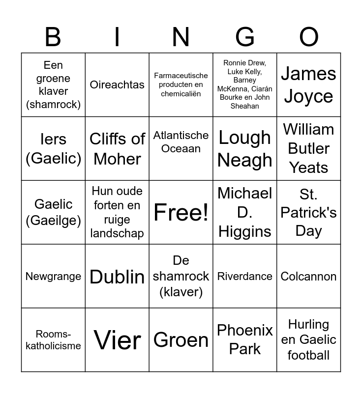 This bingo card has a free space and 24 words: Dublin, Vier, Atlantische Oceaan, Rooms-katholicisme, James Joyce, Een groene klaver (shamrock), Iers (Gaelic), Oireachtas, Michael D. Higgins, De shamrock (klaver), Lough Neagh, Gaelic (Gaeilge), Riverdance, Colcannon, Cliffs of Moher, Phoenix Park, St. Patrick's Day, Farmaceutische producten en chemicaliën, William Butler Yeats, Hun oude forten en ruige landschap, Hurling en Gaelic football, Newgrange, Ronnie Drew, Luke Kelly, Barney McKenna, Ciarán Bourke en John Sheahan and Groen.