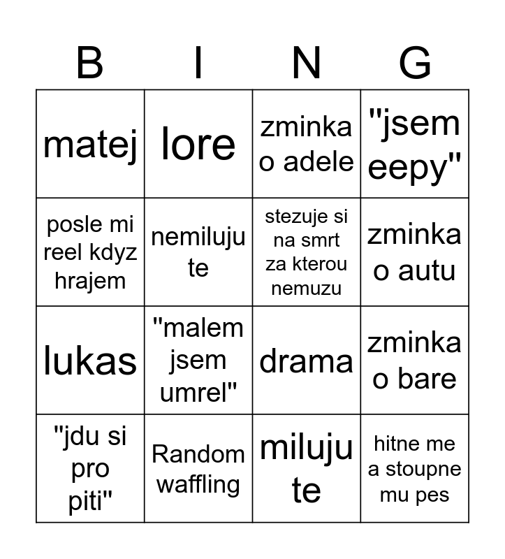 This bingo card has 16 words: Random waffling, zminka o bare, zminka o adele, matej, lukas, lore, drama, miluju te, posle mi reel kdyz hrajem, nemiluju te, ''jdu si pro piti'', ''jsem eepy'', ''malem jsem umrel'', zminka o autu, stezuje si na smrt za kterou nemuzu and hitne me a stoupne mu pes.