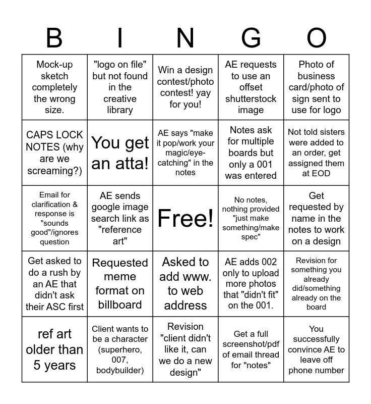 This bingo card has a free space and 24 words: Requested meme format on billboard, Client wants to be a character (superhero, 007, bodybuilder), AE says "make it pop/work your magic/eye-catching" in the notes, ref art older than 5 years, Photo of business card/photo of sign sent to use for logo, Mock-up sketch completely the wrong size., CAPS LOCK NOTES (why are we screaming?), "logo on file" but not found in the creative library, No notes, nothing provided "just make something/make spec", Asked to add www. to web address, Notes ask for multiple boards but only a 001 was entered, Email for clarification & response is "sounds good"/ignores question, AE adds 002 only to upload more photos that "didn't fit" on the 001., Revision for something you already did/something already on the board, You get an atta!, Get a full screenshot/pdf of email thread for "notes", Get requested by name in the notes to work on a design, Win a design contest/photo contest! yay for you!, Not told sisters were added to an order, get assigned them at EOD, AE sends google image search link as "reference art", You successfully convince AE to leave off phone number, Get asked to do a rush by an AE that didn't ask their ASC first, AE requests to use an offset shutterstock image and Revision "client didn't like it, can we do a new design".