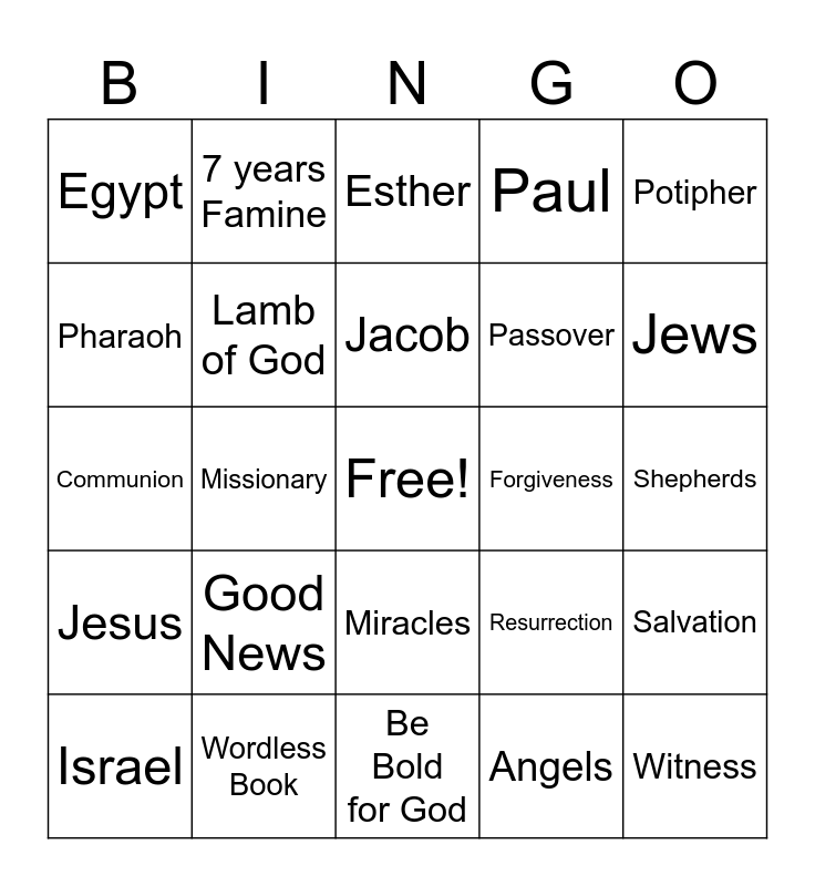 This bingo card has a free space and 24 words: Good News, Wordless Book, Jacob, Israel, Potipher, Egypt, Pharaoh, 7 years Famine, Forgiveness, Miracles, Passover, Communion, Resurrection, Salvation, Lamb of God, Angels, Shepherds, Esther, Jews, Missionary, Witness, Jesus, Paul and Be Bold for God.
