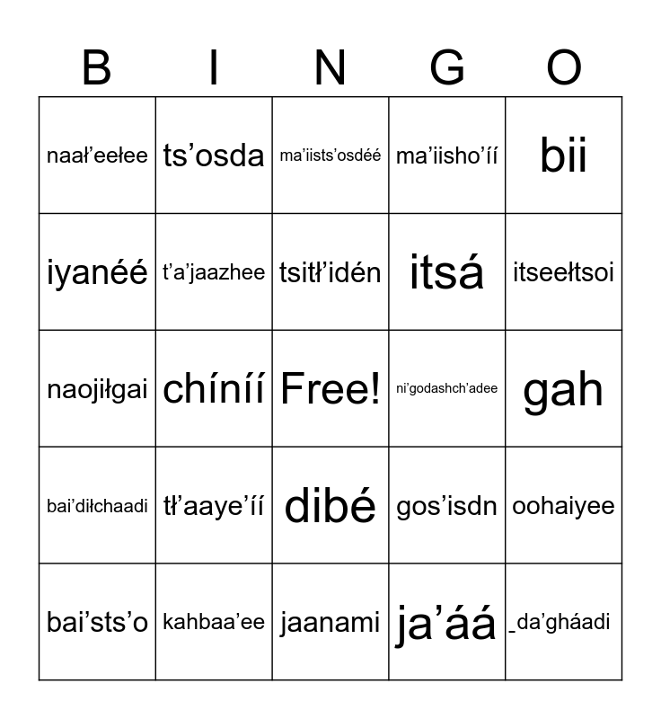 This bingo card has a free space and 52 words: góda’shchidéé, ̱da’gháadi, nagooshch’idn, jaanami, tł’aaye’íí, cháá̱́, ts’osda, tsidéé, iyanéé, máashdlógee, t’a’jaazhee, moosha, oohaiyee, gos’isdn, bis nał kis, boo, tsitł’idén, ni’godashch’adee, gágee, bii, chíníí, ja’áá, naał’eełee, itsá, dzées, łogee, ch’ałdee, maashchagéé, itseełtsoi, łii, ilatsoi, ma’iisho’íí, a’ai, dibé dził, ndo’i, ma’iists’osdéé, kahbaa’ee, yi’yee, ní’gotł’its’íí, ts’o, dló’, gah, bai’diłchaadi, t’a’łbai, dibé, k’elích’éé, máashje, naojiłgai, kajee, ts’óskeeł, bai’sts’o and chishkałdi.