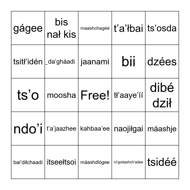 This bingo card has a free space and 52 words: oohaiyee, tsidéé, iyanéé, máashdlógee, t’a’jaazhee, gos’isdn, bis nał kis, boo, tsitł’idén, góda’shchidéé, ̱da’gháadi, k’elích’éé, máashje, naojiłgai, kajee, nagooshch’idn, jaanami, tł’aaye’íí, cháá̱́, ts’osda, moosha, ni’godashch’adee, gágee, bii, chíníí, ja’áá, naał’eełee, itsá, dzées, łogee, ch’ałdee, t’a’łbai, dibé, ts’óskeeł, bai’sts’o, maashchagéé, itseełtsoi, łii, ilatsoi, ma’iisho’íí, a’ai, dibé dził, ndo’i, ma’iists’osdéé, kahbaa’ee, yi’yee, ní’gotł’its’íí, ts’o, dló’, gah, bai’diłchaadi and chishkałdi.