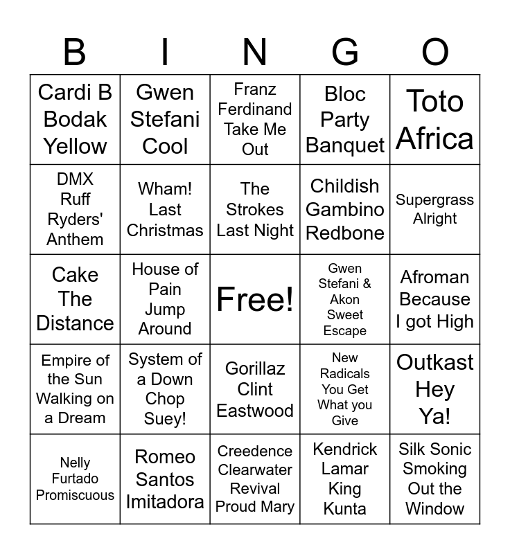 This bingo card has a free space and 40 words: MGMT Electric Feel, Cake The Distance, Taylor Swift Cruel Summer, Wham! Last Christmas, Romeo Santos Imitadora, Gorillaz Clint Eastwood, The Strokes Last Night, Harry Styles As it Was, Toto Africa, Empire of the Sun Walking on a Dream, House of Pain Jump Around, Bloc Party Banquet, Silk Sonic Smoking Out the Window, Afroman Because I got High, Gwen Stefani & Akon Sweet Escape, System of a Down Chop Suey!, Grouplove Tongue Tied, Cardi B Bodak Yellow, Jay-Z and someone else No Church in the Wild, Franz Ferdinand Take Me Out, Outkast Hey Ya!, Kendrick Lamar King Kunta, Childish Gambino Redbone, DMX Ruff Ryders' Anthem, Milky Chance Stolen Dance, The Verve Bittersweet Symphony, Two Door Cinema Club What You Know, Caesers Jerk it Out, Santana & Rob Thomas Smooth, White Stripes Seven Nation Army, Skee-Lo I Wish, Nelly Furtado Promiscuous, Beck E-Pro, New Radicals You Get What you Give, Supergrass Alright, Creedence Clearwater Revival Proud Mary, Tina Turner Proud Mary, Amy Winehouse Back to Black, Gwen Stefani Cool and Paramore Misery Business.