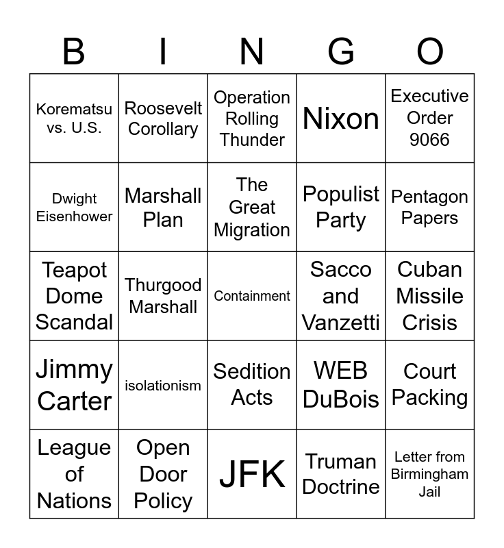 This bingo card has a free space and 24 words: isolationism, Open Door Policy, The Great Migration, League of Nations, Executive Order 9066, Korematsu vs. U.S., Dwight Eisenhower, Roosevelt Corollary, Sacco and Vanzetti, Sedition Acts, Populist Party, Teapot Dome Scandal, WEB DuBois, Court Packing, Marshall Plan, Truman Doctrine, Cuban Missile Crisis, Operation Rolling Thunder, Pentagon Papers, Thurgood Marshall, Letter from Birmingham Jail, Jimmy Carter, Nixon and JFK.