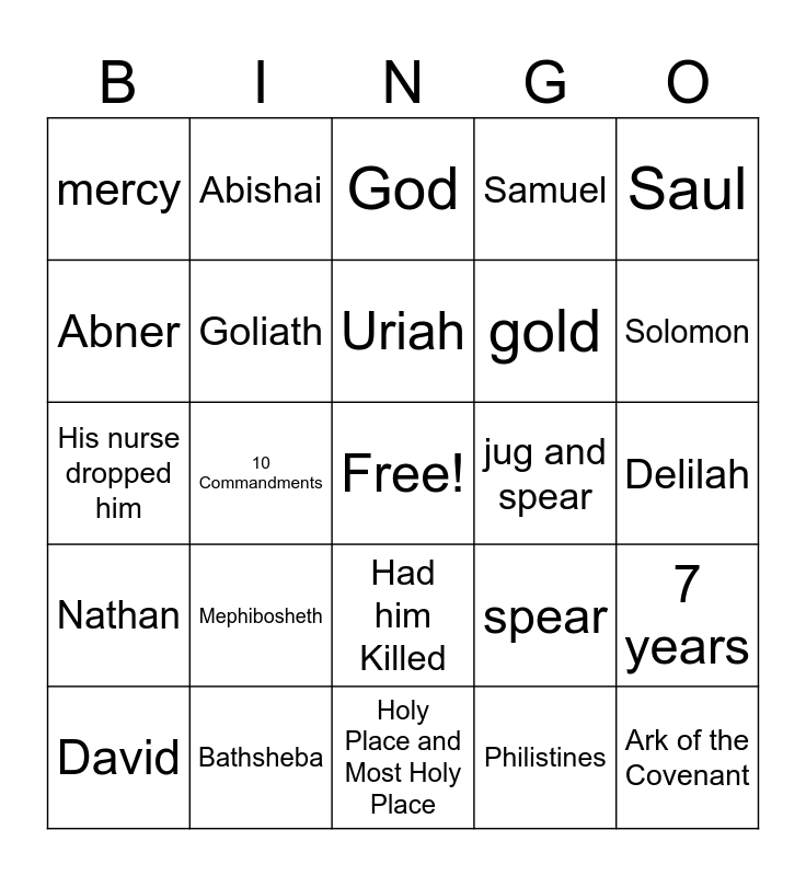 This bingo card has a free space and 24 words: Mephibosheth, Bathsheba, Uriah, David, Saul, mercy, Abner, Abishai, jug and spear, Had him Killed, gold, His nurse dropped him, spear, 7 years, Goliath, Philistines, Delilah, God, Solomon, 10 Commandments, Ark of the Covenant, Nathan, Samuel and Holy Place and Most Holy Place.