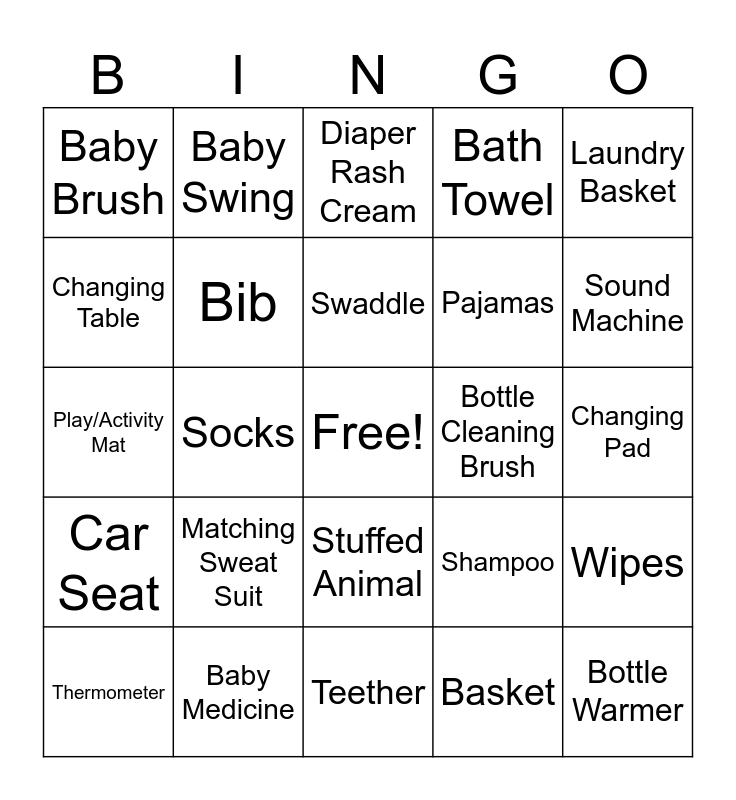 This bingo card has a free space and 56 words: Baby Spoon, Thermometer, Binky, Baby Brush, Teether, Book, Bib, Pants, Pajamas, Onesie/Body Suit, Bath Towel, Burp Rags, Lotion, Car Mirror, Bottle Drying Rack, Diaper Pale, Laundry Basket, Socks, Crib Sheets, Bottle Warmer, Bottle Cleaning Brush, Sleep Sack, Shampoo, Diaper Rash Cream, Baby Monitor, Swaddle, Blanket, Bottle, Sound Machine, Bassinet, Mittens, Blocks, High Chair, Baby Carrier, Changing Pad, Changing Table, Play/Activity Mat, Diaper Bag, Car Seat, Baby Swing, Stuffed Animal, Bath Toys, Something Blue, Personalized with Tucker, Something Colorado Themed, Matching Sweat Suit, Baby Medicine, Nose Aspirator, Car Window Shade, Nursing Items, Basket, Bath Tub, Pack n Play, Diapers, Wipes and Baby Bouncer.